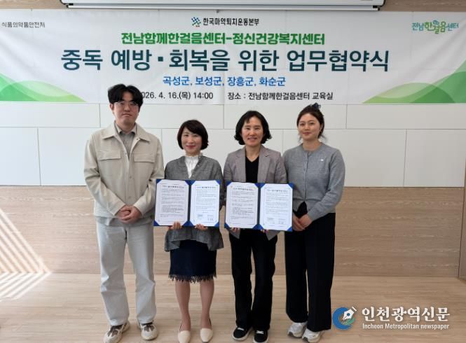 [인천광역신문] 최예준 기자 | 화순군은 지난 16일 화순군정신건강복지센터가 전남함께한걸음센터와 지역사회 마약류 및 약물 오남용 예방과 회복 지원 강화를 위한 업무협약(MOU)을 체결했다고 밝혔다.