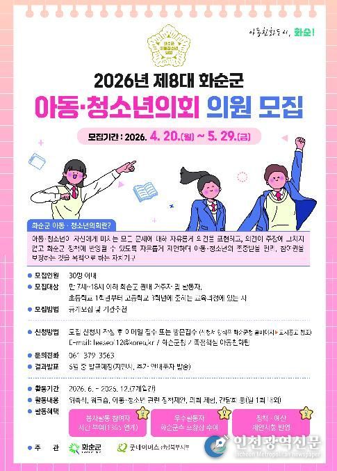 [인천광역신문] 최예준 기자 | 화순군은 ‘2026년 제8대 화순군 아동·청소년의회’ 의원 30명을 오는 4월 20일부터 5월 29일까지 공개 모집한다고 밝혔다.