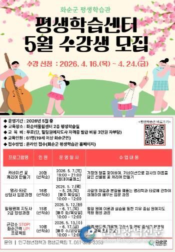 수강 신청은 4월 16일부터 4월 24일까지 화순군 평생학습관 누리집을 통해 온라인으로 접수하면 된다.