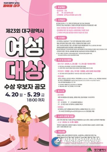 [인천광역신문] 최예준 기자 | 대구광역시는 여성의 지위 향상과 양성평등 실현에 공헌한 여성 인재를 발굴·격려하기 위해 ‘2026년 제23회 대구광역시 여성대상’ 수상 후보자를 4월 20일부터 5월 29일까지 공개 모집한다.
