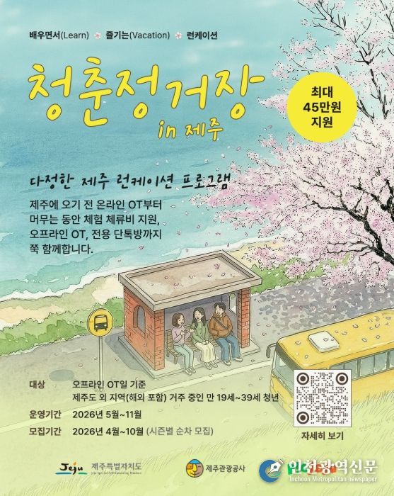 [인천광역신문] 최예준 기자 | 제주특별자치도와 제주관광공사(사장 고승철)는 오는 5월 3일까지 제주인구정책 통합플랫폼을 통해 도외 거주 청년을 대상으로 제주에서 배우며 방학을 즐길 런케이션 참가자를 모집하고 있다고 17일 밝혔다.