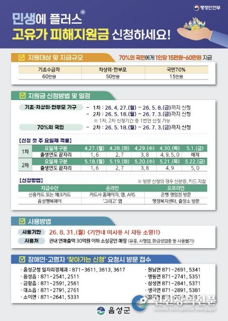이번 지원금의 지급 대상은 올해 3월 30일 기준, 70%의 국민에게 소득 수준과 거주 지역에 따라 차등 지급한다. 특히 음성군은 비수도권으로 기초수급자 60만원, 차상위 및 한부모 50만원, 소득하위 70% 군민은 1인당 15만원을 지급받는다.