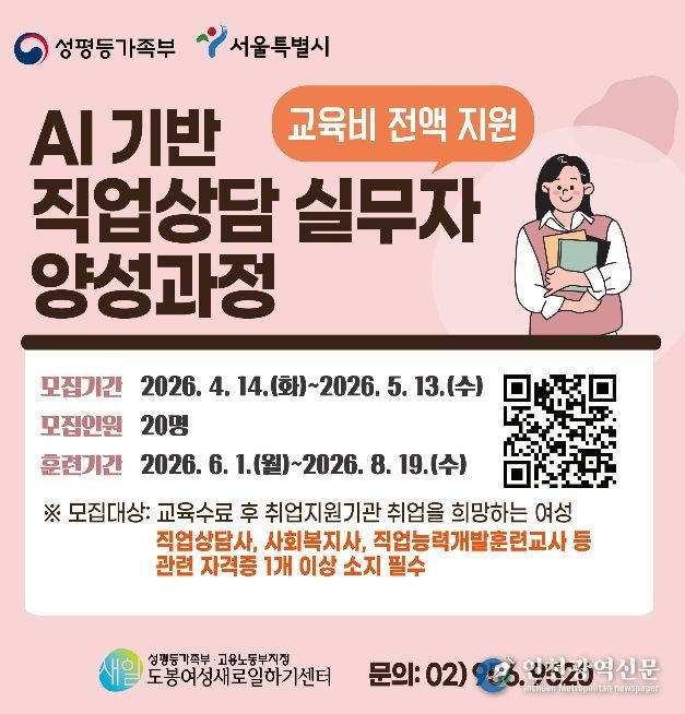[인천광역신문] 최예준 기자 | 서울 도봉구가 도봉여성센터에서 ‘AI 기반 직업상담 실무자 양성과정’을 운영한다고 밝혔다. 대상은 직업상담사, 사회복지사, 직업능력개발훈련교사 등의 자격증을 소지하고, 취업지원 분야로 취업을 희망하는 여성 구직자다.