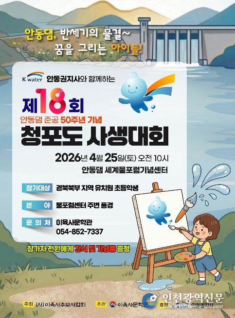 이번 대회는 안동댐 준공 50주년을 기념해 마련된 행사로, 유치원생과 초등학생을 대상으로 진행된다. 참가자들은 대회 당일 접수처에서 배부하는 8절지에 세계물포럼기념센터 주변 풍경을 자유롭게 그리면 된다.