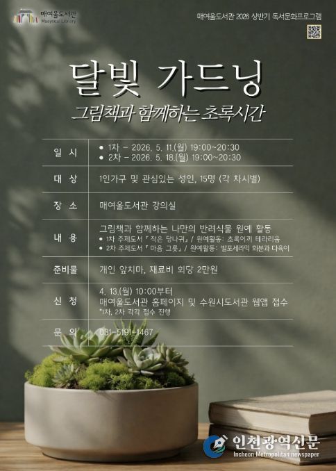 [인천광역신문] 최예준 기자 | 수원시 매여울도서관이 그림책 읽기와 식물 가드닝을 결합한 체험형 프로그램 ‘달빛 가드닝, 그림책과 함께하는 초록시간’을 운영한다.