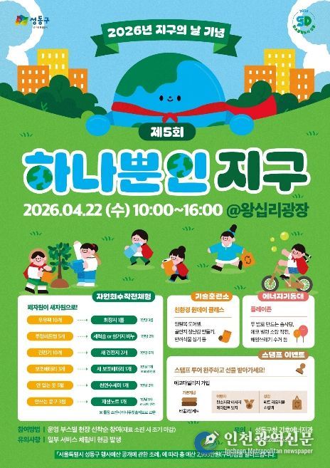 [인천광역신문] 최예준 기자 | 서울 성동구는 오는 4월 22일 왕십리광장에서 기후위기의 심각성을 알리고 탄소중립 실천 문화를 확산하기 위한 ‘제5회 하나뿐인 지구’ 행사를 개최한다고 밝혔다.