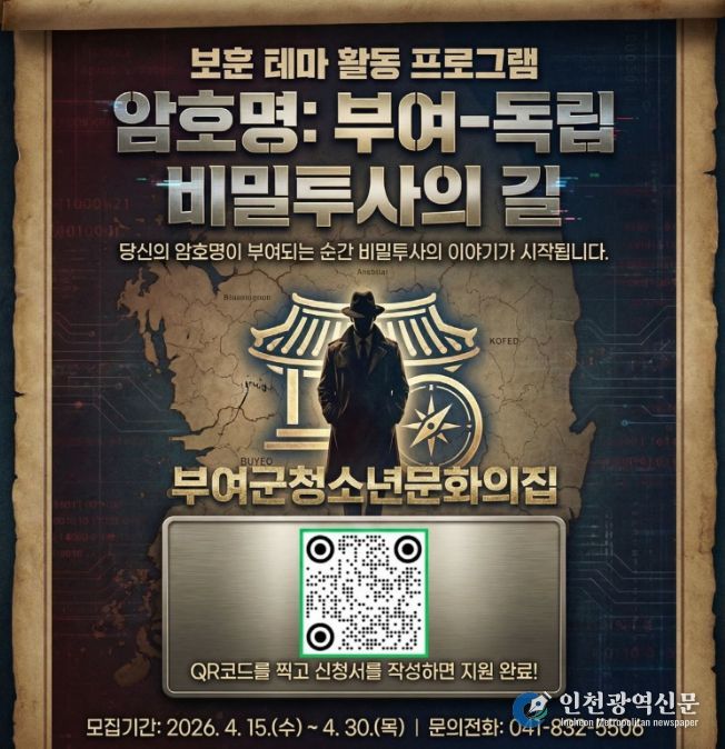 [인천광역신문] 최예준 기자 | 부여군시설관리공단 청소년문화의집은 국가보훈부 공모사업에 선정된 2026년 보훈 테마 활동 프로그램 '암호명 부여-독립 비밀투사의 길'에 참여할 청소년을 4월 30일까지 모집한다.
