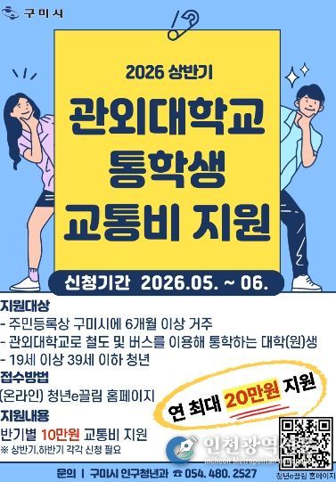 [인천광역신문] 최예준 기자 | 구미시가 관외 대학(원)생의 통학 부담을 줄이기 위해 교통비 지원 방식을 대폭 손질했다. 실비 정산을 폐지하고 연 최대 20만원 정액 지원으로 전환하는 한편, 증빙 절차를 간소화해 청년 체감도를 높인 것이 핵심이다.