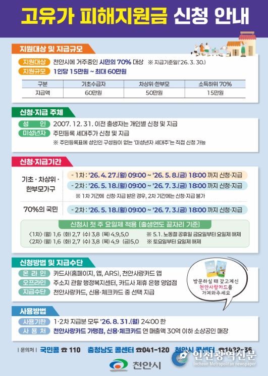 김석필 천안시장 권한대행 부시장은 “고유가로 힘든 시기를 보내는 시민들에게 이번 지원금이 실질적인 버팀목이 되길 바란다”며 “대상별 신청 기간이 다른 만큼 시민들이 혼선을 겪지 않도록 홍보와 행정 지원에 총력을 기울이겠다”고 말했다.