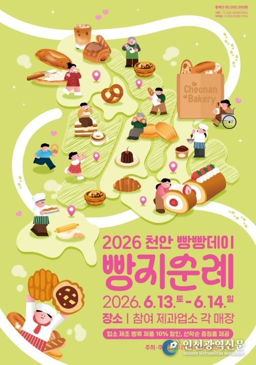 [인천광역신문] 최예준 기자 | 천안시는 오는 6월 13일부터 14일까지 이틀간 열리는 ‘2026 천안 빵지순례 빵빵데이’에 참여할 순례단 450팀을 내달 4일까지 모집한다고 20일 밝혔다.
