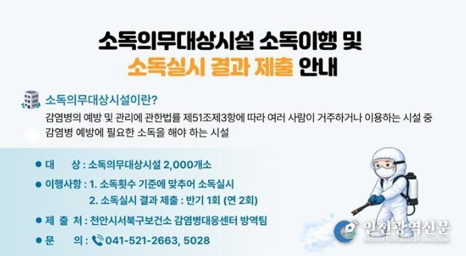 [인천광역신문] 최예준 기자 | 천안시는 감염병 예방을 위해 소독의무대상시설을 대상으로 정기 소독 이행 여부에 대한 집중 관리를 실시한다고 20일 밝혔다.