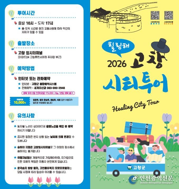 한편, '힐링해' 고창 시티투어버스는 사전 예약제로 운영되며, 고창군 홈페이지 통합예약시스템 및 전화 예약을 통해 예약할 수 있다.