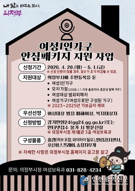 [인천광역신문] 최예준 기자 | 의정부시는 4월 20일부터 5월 1일까지 12일간 온․오프라인을 통해 여성 1인 가구 안심패키지 지원사업의 신청을 접수한다.