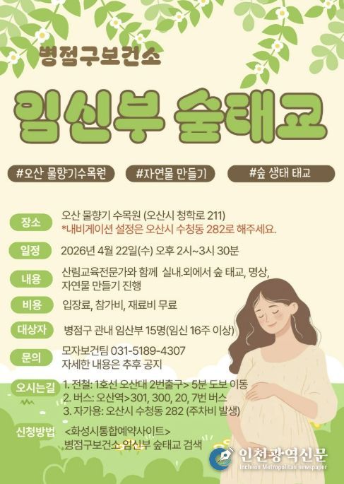 [인천광역신문] 최예준 기자 | 화성특례시 병점구보건소는 임신부의 정서적 안정과 건강한 출산을 지원하기 위해 오는 22일 ‘임신부 숲태교 프로그램’을 운영한다고 밝혔다.