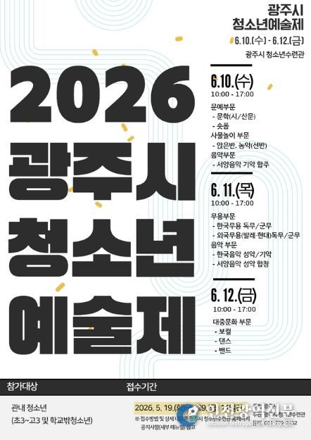 [인천광역신문] 최예준 기자 | 광주시는 ‘2026년 광주시 청소년예술제’ 참가자를 모집한다고 20일 밝혔다.