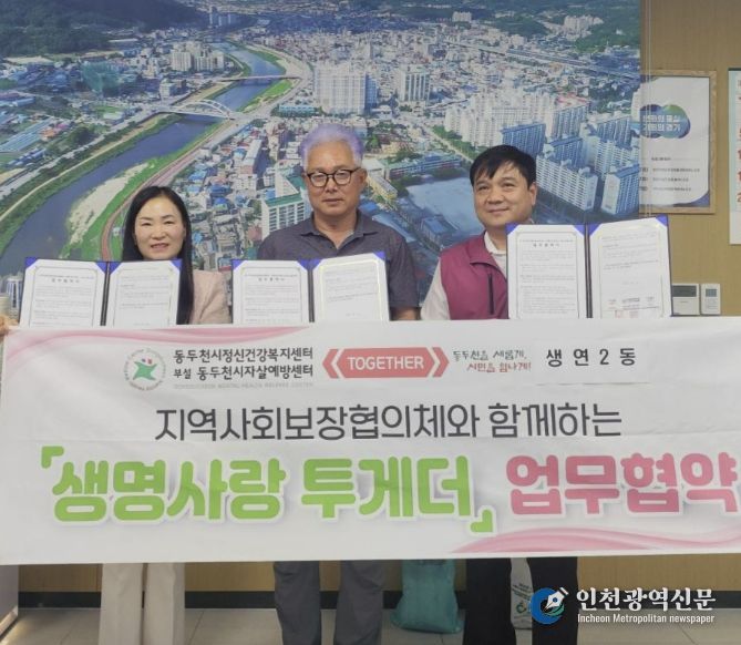 [인천광역신문] 최예준 기자 | 동두천시정신건강복지센터 부설 자살예방센터는 ‘생명사랑 투게더’사업 추진을 위해 지난 17일, 생연2동 행정복지센터 및 생연2동 지역사회보장협의체와 업무협약을 체결했다.