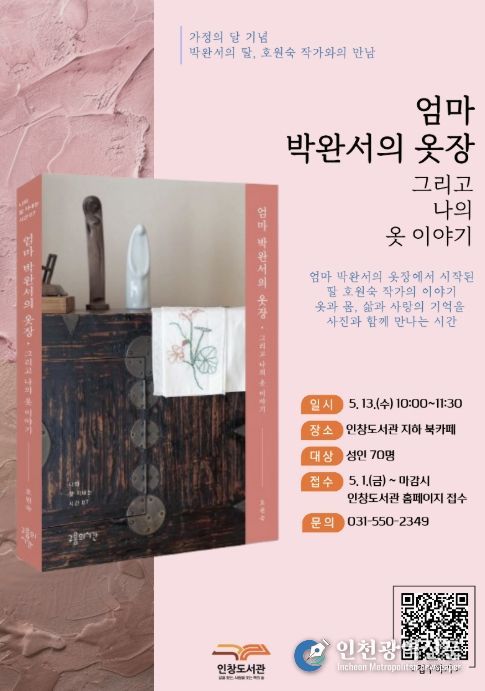[인천광역신문] 최예준 기자 | 구리시립도서관은 '호원숙 작가와의 만남 ‘엄마 박완서의 옷장, 그리고 나의 이야기’' 참여 신청을 오는 5월 1일부터 접수한다고 밝혔다.