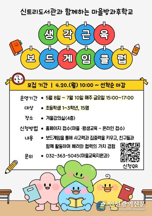 [인천광역신문] 최예준 기자 | 인천광역시교육청신트리도서관은 20일부터 어린이의 인지 발달과 사회성 함양을 위한 ‘생각 근육 보드게임’ 참가자를 모집한다.