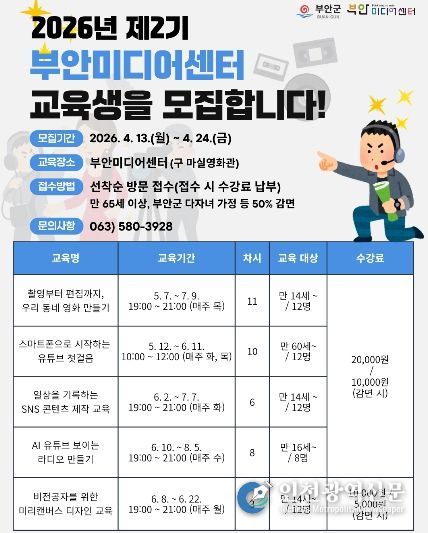 [인천광역신문] 최예준 기자 | 부안미디어센터는 군민의 미디어 활용 역량 강화를 위해 2026년 제2기 미디어 교육 교육생을 모집한다고 밝혔다.