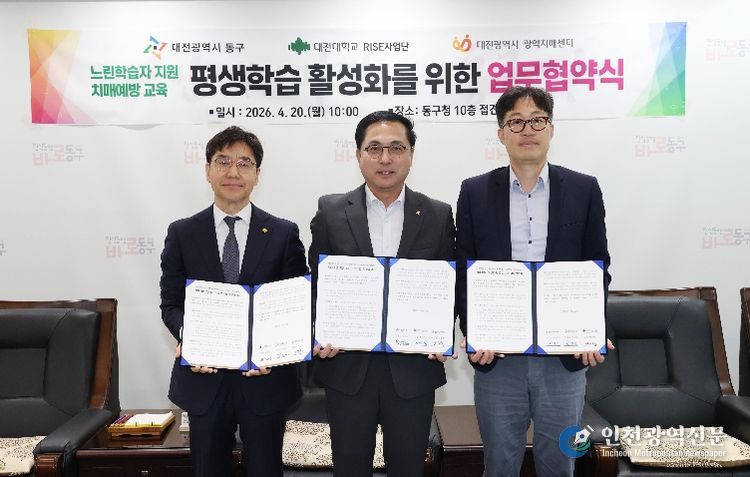 [인천광역신문] 최예준 기자 | 대전 동구는 20일 대전대학교 RISE사업단‧대전시치매센터와 ‘느린학습자 평생교육 지원’과 ‘치매예방 프로그램 운영’을 위한 업무협약을 체결했다고 밝혔다.