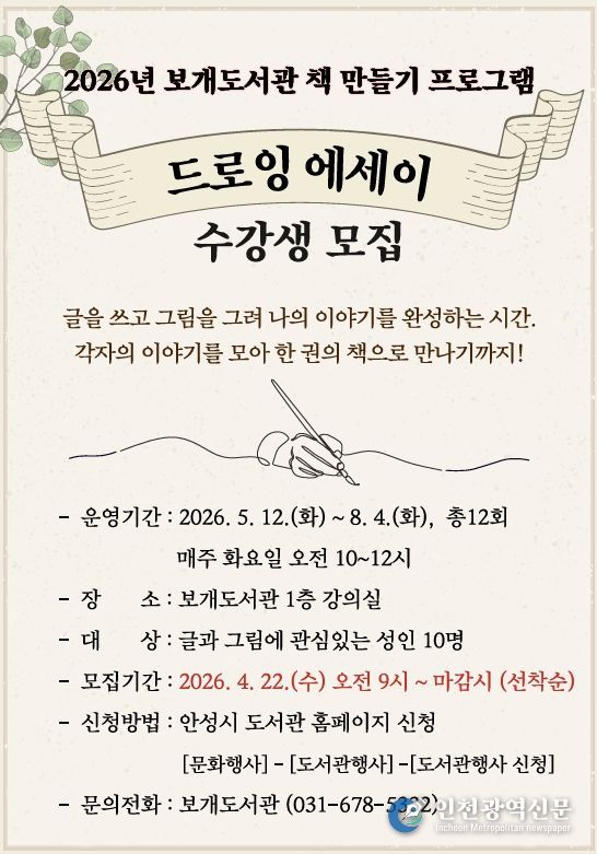 [인천광역신문] 최예준 기자 | 안성시 보개도서관(책문화센터)이 시민들의 창작 활동을 지원하고 일상 속 예술 경험을 확대하기 위해 오는 5월부터 ‘드로잉 에세이’와 ‘포토 에세이’ 책 만들기 프로그램을 새롭게 운영한다고 밝혔다.