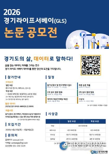 경기연구원은 이번 조사를 통해 확보한 대규모 데이터를 기반으로 데이터 중심의 과학적 행정을 뒷받침하고, 증거 기반 연구 역량을 한층 강화하는 데 주력할 방침이다. 연구 데이터의 지속가능성을 확보하고 창의적인 분석 아이디어를 통해 정책 활용도를 높이기 위해 ‘2026년 경기 라이프 서베이(GLS) 논문 공모전’을 개최할 예정이며, 이를 통해 도출된 제안과 분석 결과를 실질적인 정책 근거자료로 활용할 계획이다.