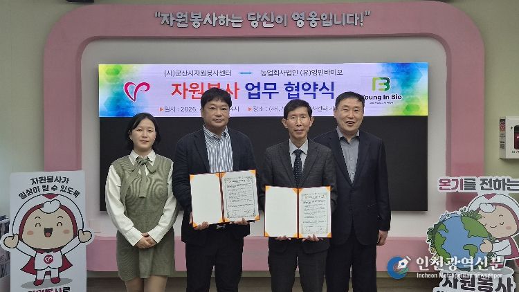 [인천광역신문] 최예준 기자 | (사)군산시자원봉사센터(이사장 황진)와 농업회사법인 (유)영인바이오(대표 최인정)는 4월 20일 오후 2시, 군산시자원봉사센터 세미나실에서 자원봉사 활성화를 위한 업무협약(MOU)을 체결했다.