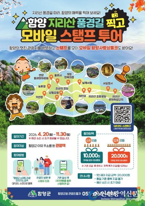 [인천광역신문] 최예준 기자 | 함양군은 함양의 대표 관광자원을 보다 쉽고 재미있게 즐길 수 있도록, 관광객 참여형 이벤트인 ‘함양 지리산 풍경길 찍고 모바일 스탬프 투어’를 운영한다고 밝혔다.