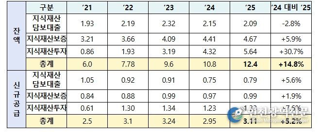 지식재산 금융 잔액은 ’24년 말 10.8조원에서 ’25년 말 12.4조원으로 증가하여 전년대비 14.8% 성장했다. 2025년 지식재산 금융 신규공급은 총 3.1조원으로, 2024년 2.95조원 대비 5.2% 증가했다.