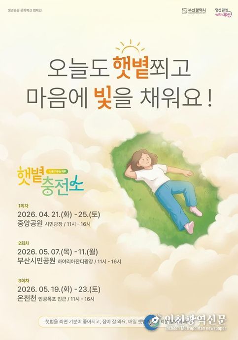[인천광역신문] 최예준 기자 | 부산시는 오늘(21일)부터 5월까지 3차례에 걸쳐 시민의 마음건강 증진과 생명존중 문화 확산을 위한 참여형 캠페인 '햇볕충전소 – 나를 키우는 하루'를 운영한다고 밝혔다.