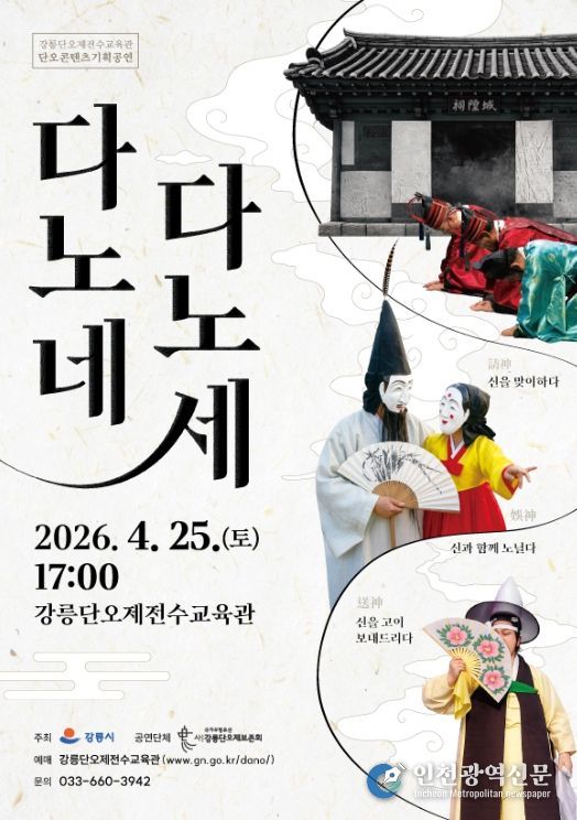 [인천광역신문] 최예준 기자 | 강릉시 강릉단오제전수교육관은 강릉단오제의 전승발전과 의미를 쉽게 전달하기 위해 오는 25일 오후 5시 강릉단오제전수교육관 공연장에서 '다노네, 다노세' 공연을 개최한다.