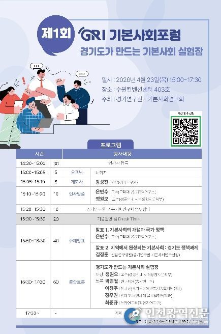 [인천광역신문] 최예준 기자 | 경기연구원은 오는 23일 오후 3시 수원컨벤션센터 403호에서 ‘경기도가 만드는 기본사회 실험장’을 주제로 ‘제1회 GRI 기본사회포럼’을 개최한다.
