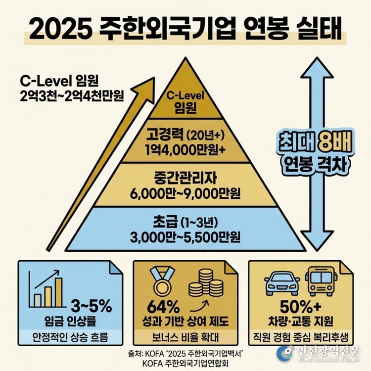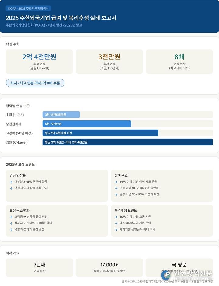 [인천광역신문] 최예준 기자 | 주한외국기업연합회(상임대표 김종철, KOFA)는 ‘2025 주한외국기업백서’ 혁신판을 발표하고, 작년 6월 실시한 주한외국기업 급여 및 상여금 실태조사와 함께 복리후생 조사 결과를 포함해 공개했다. 이번 백서는 7년째 발간되는 자료로, 기존 조사 대비 한층 고도화된 분석 체계를 적용해 글로벌 전문 조사기관 수준의 HR 리포트로 업그레이드됐다는 평가를 받고 있다.
