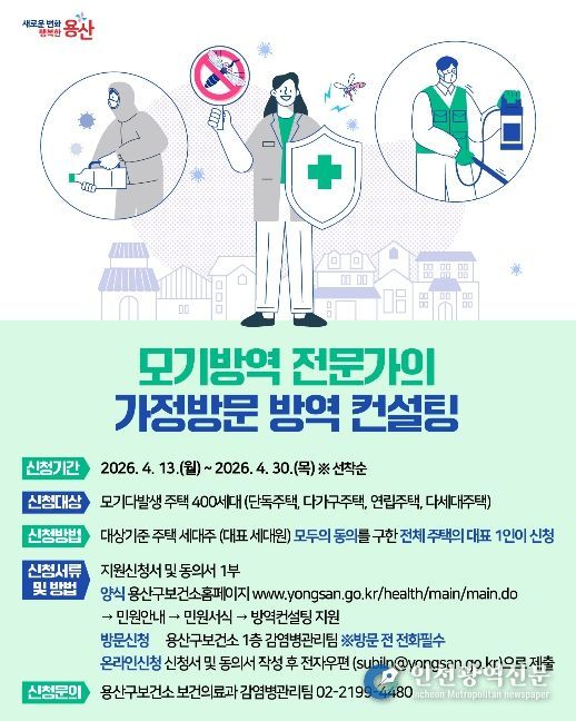 [인천광역신문] 최예준 기자 | 서울 용산구가 다가오는 여름철 모기 매개 감염병 예방과 주민들의 쾌적한 주거 환경 조성을 위해 ‘모기방역 전문가 가정방문 컨설팅’을 500가구로 대폭 확대 추진한다.