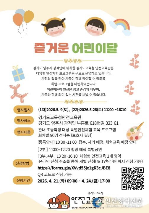 [인천광역신문] 최예준 기자 | 경기도교육청안전교육관이 가정의 달을 맞아 가족이 함께 참여해 안전의 중요성을 쉽고 즐겁게 배울 수 있도록 ‘가정의 달 안전교육 특별 프로그램’을 운영한다.