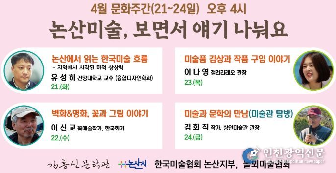 [인천광역신문] 최예준 기자 | 김홍신문학관 문화교실이 4월 네번째주에 시작한다. 이번 달 주제는 미술인데, 21일 “논산에서 읽는 한국미술 흐름”을 시작으로 24일 향인미술관 탐방까지 이어진다.