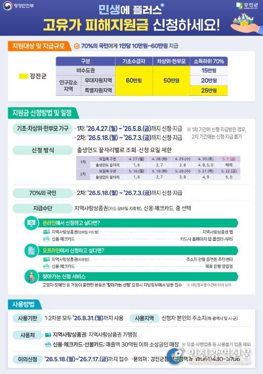 지역사랑상품권은 강진군 내 가맹점에서 사용할 수 있고, 신용·체크카드는 연매출 30억원 이하 소상공인업체 등에서 가능하다. 사용기한은 2026년 8월 31일까지이며, 기한 내 사용하지 못 할 경우 지원금은 소멸한다.