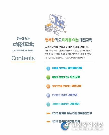 [인천광역신문] 최예준 기자 | 대전교육과학연구원 대전교육정책연구소는 2025년 대전교육 주요 정책의 성과를 종합적으로 분석한 ‘한눈에 보는 대전교육’을 발간했다고 밝혔다.