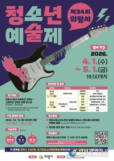 [인천광역신문] 최예준 기자 | 의왕시청소년재단 산하 의왕시청소년수련관은 지역 청소년의 예술적 재능과 끼 발산의 장인 ‘제34회 의왕시청소년예술제’의 참가자를 5월 1일까지 모집한다고 밝혔다.