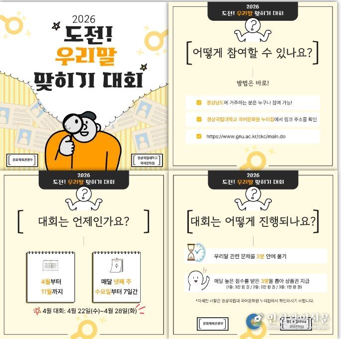 [인천광역신문] 최예준 기자 | 경상국립대학교국어문화원(원장 박용식 국어국문학과 교수)은 경상남도민을 대상으로 ‘2026 도전! 우리말 맞히기 대회’를 개최한다.