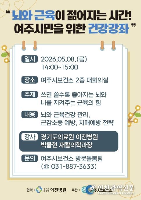 [인천광역신문] 최예준 기자 | 여주시보건소 건강증진과는 오는 5월 8일 오후 2시, 보건소 2층 대회의실에서 여주시민을 위한 건강강좌 '뇌와 근육이 젊어지는 시간!'을 개최한다고 밝혔다.