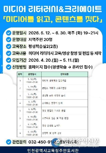 [인천광역신문] 최예준 기자 | 인천광역시교육청주안도서관은 시민의 디지털 역량 강화와 올바른 미디어 활용을 돕기 위해, 5월 12일부터 미디어 리터러시 교육 프로그램 ‘미디어를 읽고, 콘텐츠를 짓다’를 운영한다.