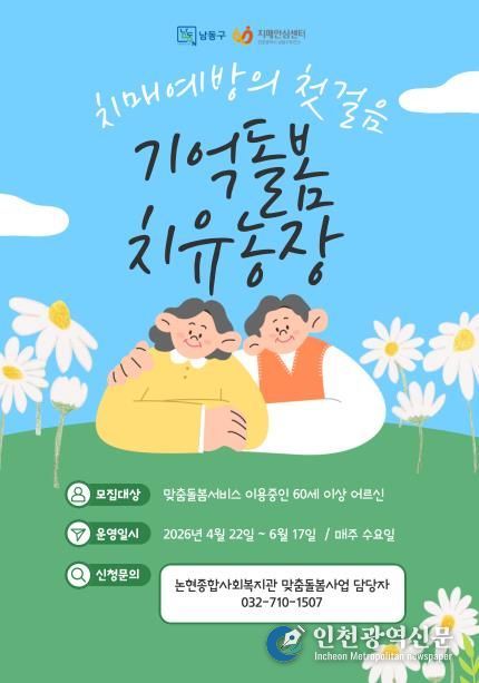 [인천광역신문] 최예준 기자 | 인천시 남동구보건소가 자연 속 농업 활동을 활용한 치매 예방 프로그램 ‘기억돌봄 치유농장’을 올해부터 정식 사업으로 확대 운영한다.