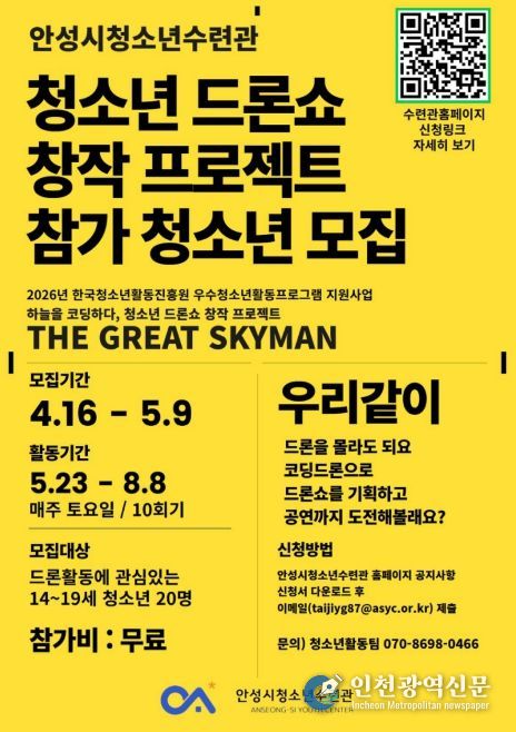 [인천광역신문] 최예준 기자 | 안성시청소년수련관은 미래 디지털 인재 양성을 위한 청소년 참여형 프로그램 '하늘을 코딩하다, 청소년 드론쇼 창작 프로젝트 ‘THE GREAT SKYMAN’'에 참여할 청소년을 4월 16일 ~ 5월 8일까지 모집한다고 밝혔다.