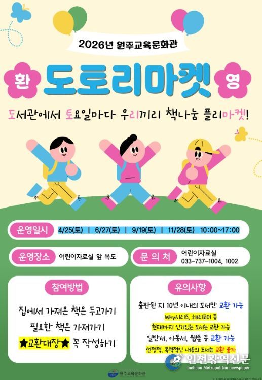 [인천광역신문] 최예준 기자 | 원주교육문화관은 4월 25일부터 책나눔 ‘도토리마켓’을 운영한다.