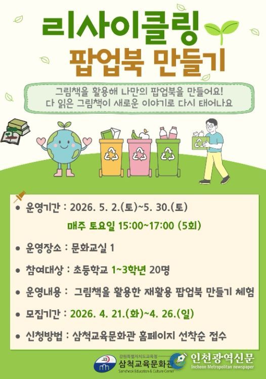 [인천광역신문] 최예준 기자 | 삼척교육문화관은 어린이들의 창의적 표현력을 높이고 자원 순환의 가치를 널리 알리기 위해 그림책을 활용한 ‘리사이클링 팝업북 만들기’ 프로그램을 운영한다.