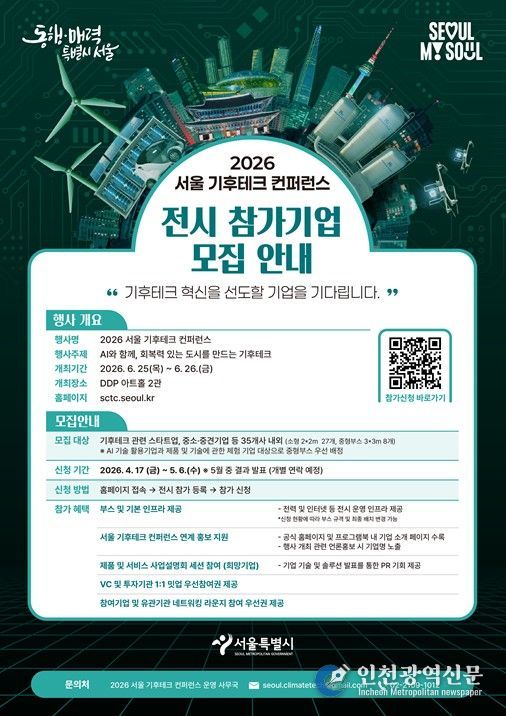 [인천광역신문] 최예준 기자 | 서울시는 4월 17일부터 5월 6일까지 ‘2026 기후테크 컨퍼런스’ 참여할 혁신 기업을 모집한다. “AI와 함께, 회복력 있는 도시를 만드는 기후테크”를 주제로 열리는 이번 행사는 환경의 달을 맞아 6월 25일~26일 이틀간 DDP 아트홀 2관에서 개최된다.
