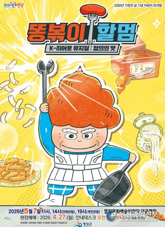 [인천광역신문] 최예준 기자 | 영광군은 오는 5월 7일 오전 11시(단체관람), 오후 2시(단체관람), 7시에 영광문화예술의전당 대공연장에서 가정의 달 특집공연 웃음과 감동, 그리고 건강한 메시지를 전하는 이야기 ‘어린이뮤지컬 똥볶이 할멈’을 공연한다.