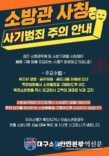 [인천광역신문] 최예준 기자 | 최근 소방공무원을 사칭해 소방용품 구매를 강매하거나 특정 업체와의 계약을 유도하는 범죄가 전국적으로 확산되고 있어 시민들의 각별한 주의가 요구된다.