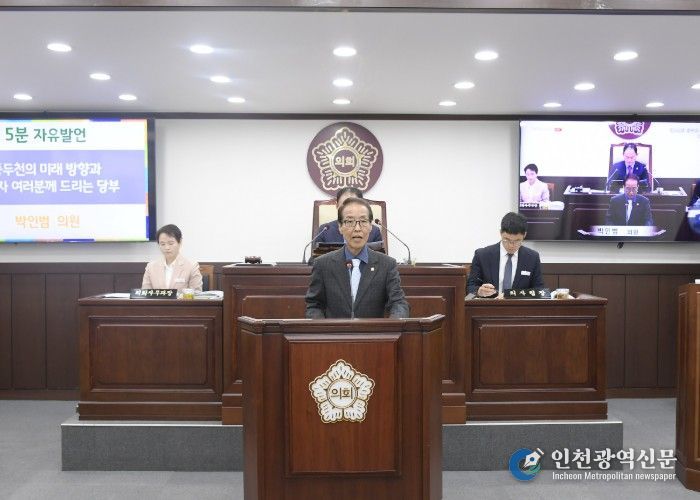 [인천광역신문] 최예준 기자 | 동두천시의회 박인범 의원(더불어민주당, 나선거구)이 제345회 임시회 폐회식에서 시의원으로서의 마지막 5분 자유발언에 나섰다. 제1대, 제8대, 제9대 동두천시의원과 제8대 경기도의회 의원을 거친 박 의원은 이번 임기를 끝으로 의정활동을 마무리하며, 공직자들에게 '시민이 찾아오는 동두천'을 향한 당부의 메시지를 전했다.